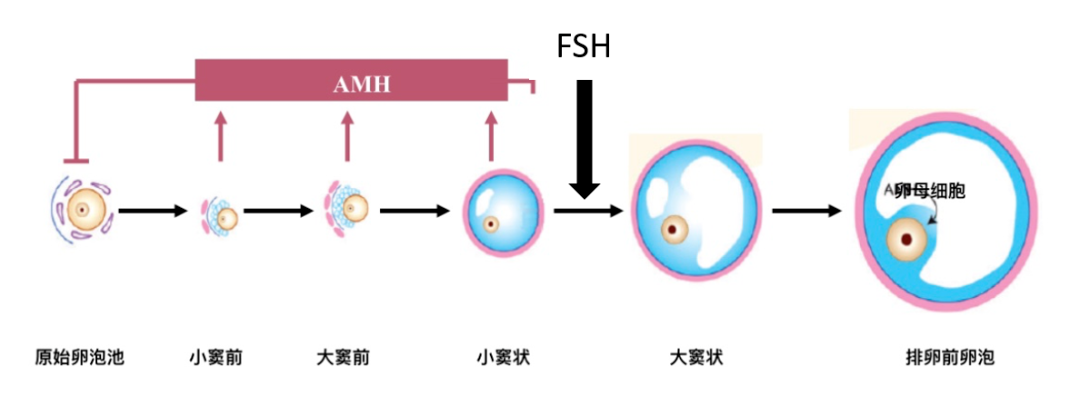 出生后, AMH可调节男性睾丸间质细胞的功能;在成年女性中,AMH抑制原始卵泡的募集和窦卵泡的发育,防止卵泡过早耗竭。AMH是由窦前卵泡和小窦卵泡产生,随窦卵泡数减少而下降,其分泌不随月经周期变化,表达量稳定,是反映卵巢储备功能准确和可靠的指标。